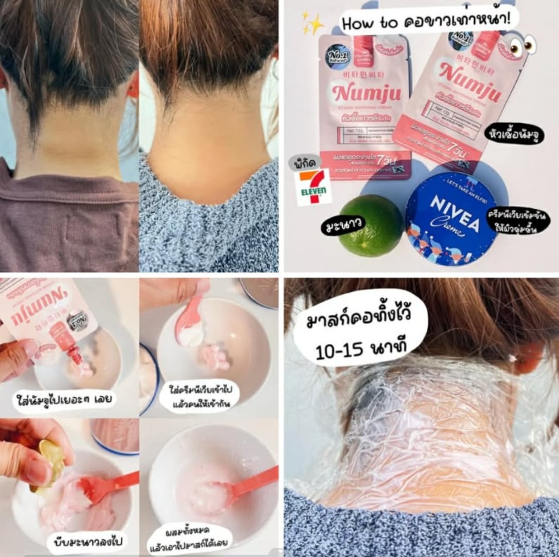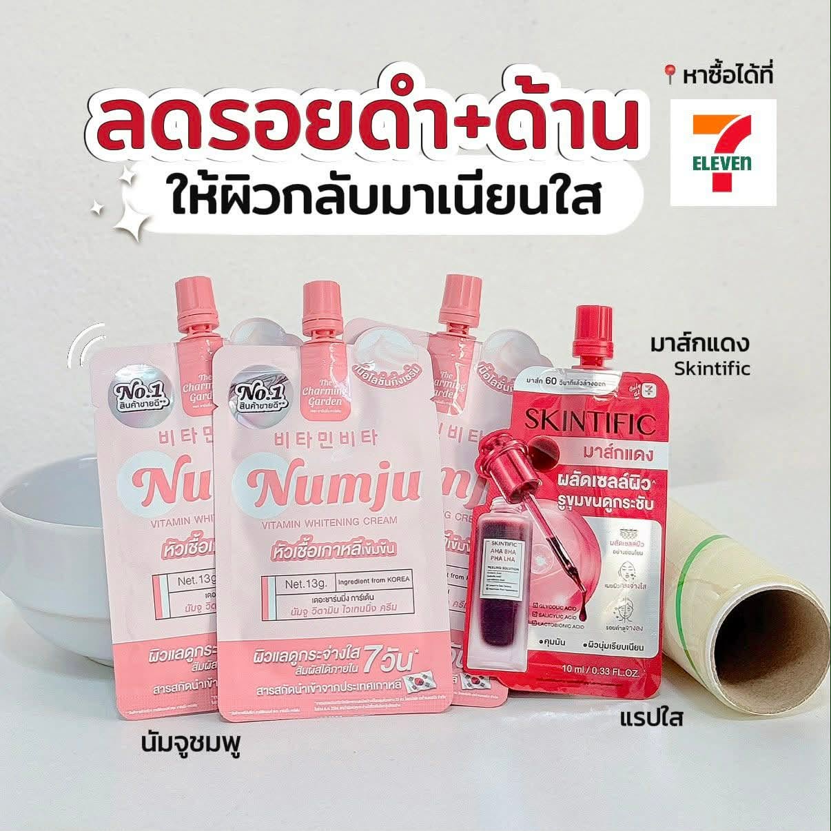 Chuẩn bị: 3 gói kem Numju hồng và 1 gói mặt nạ dưỡng chất (hoặc serum trắng da đậm đặc).