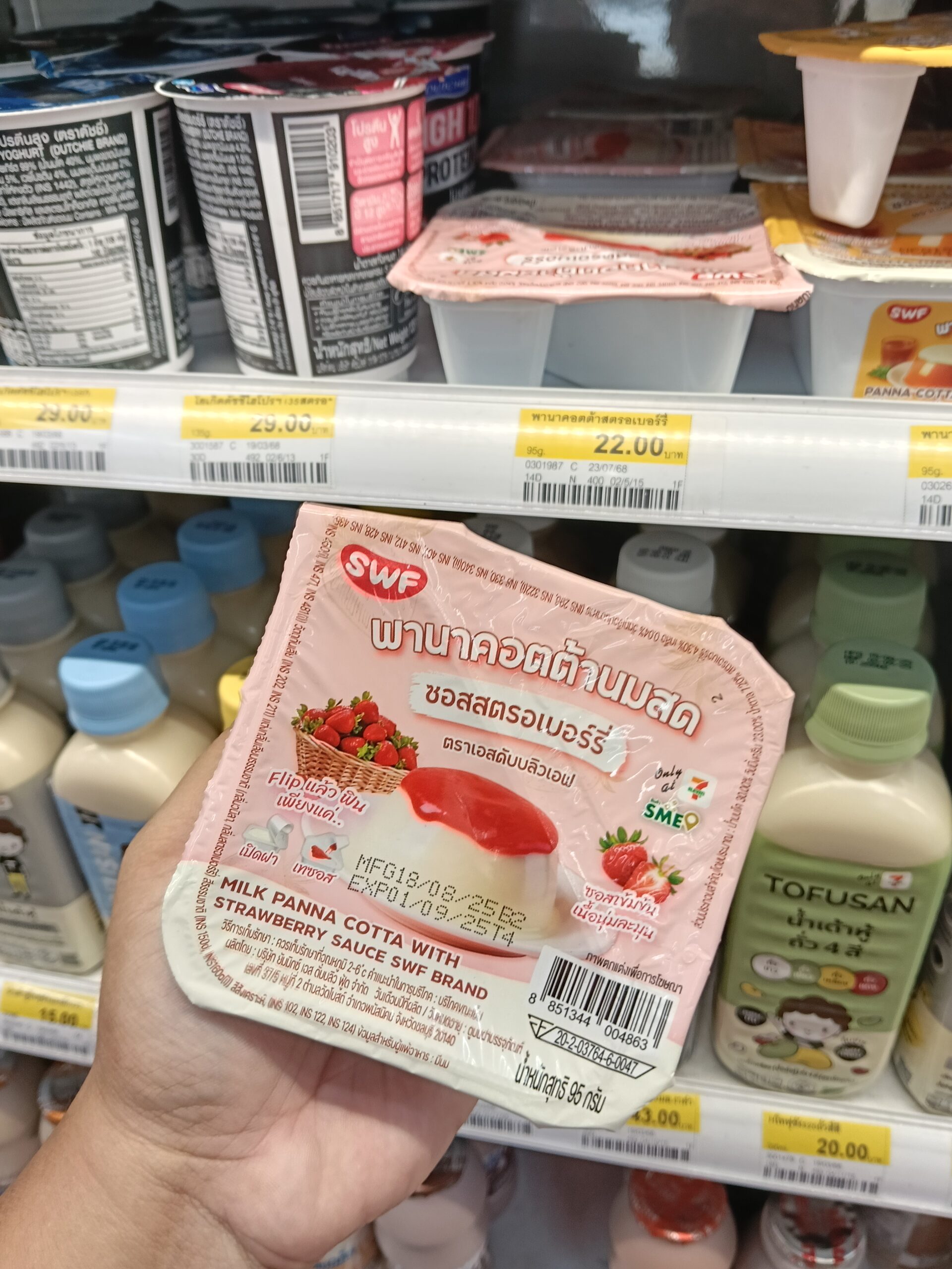 Bánh Panna Cotta Sữa Tươi (Milk Panna Cotta) với Xốt Dâu Tây của thương hiệu SWF. Đây là một món tráng miệng đóng gói sẵn phổ biến, thường được tìm thấy trong các cửa hàng tiện lợi 7-Eleven ở Thái Lan.