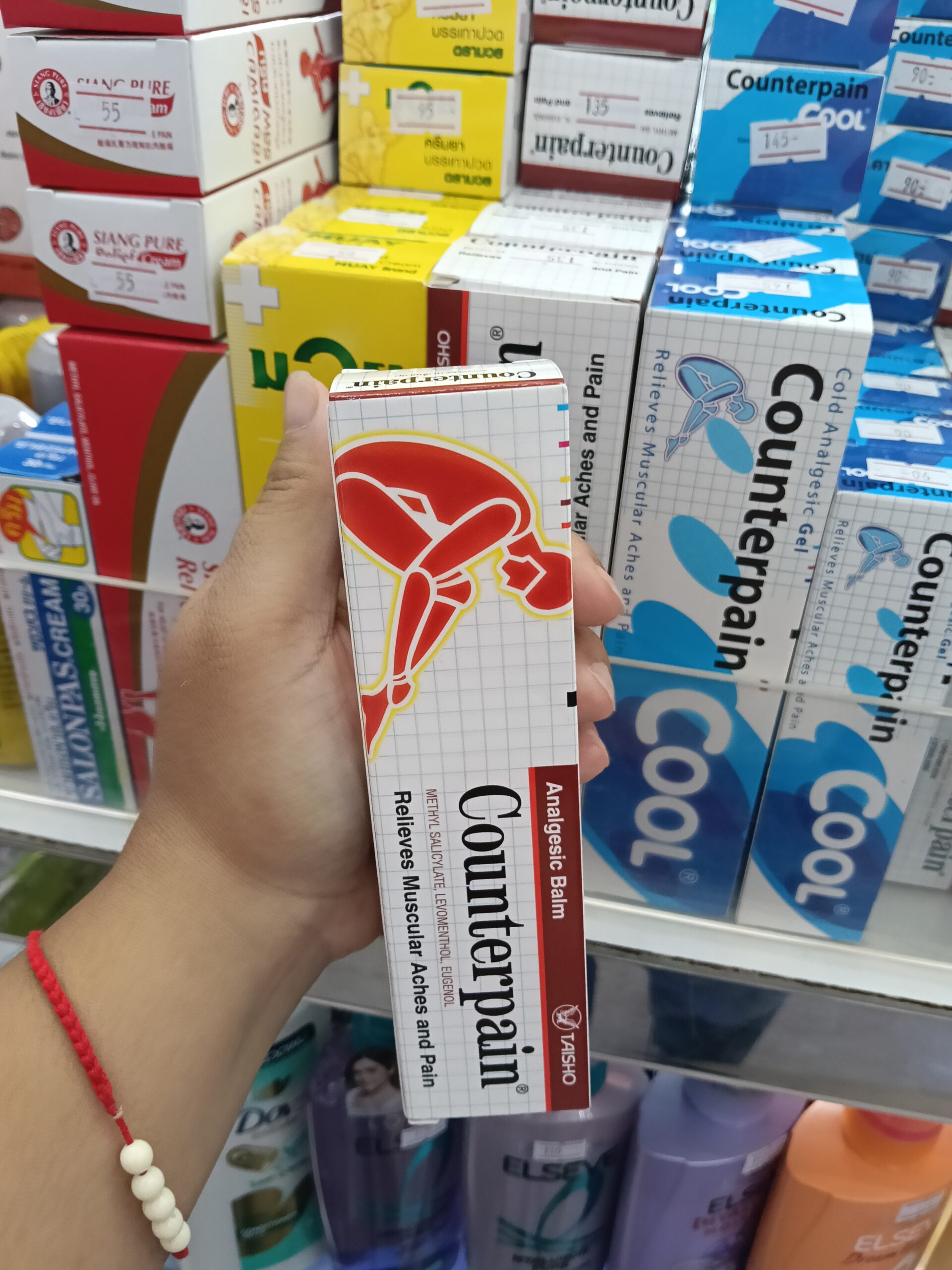 Cao xoa bóp giảm đau Counterpain (loại nóng, bao bì màu đỏ). Đây là một loại kem/dầu xoa bóp ngoài da nổi tiếng của Thái Lan, sản xuất bởi tập đoàn Taisho Nhật Bản.