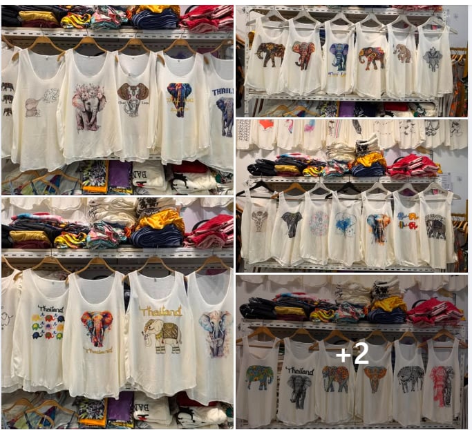 - Đặc điểm sản phẩm: Hình ảnh cho thấy các mẫu áo thun và áo ba lỗ màu trắng in họa tiết voi với dòng chữ “Thailand” ở nhiều kiểu dáng và màu sắc khác nhau. Đây là những món quà lưu niệm đặc trưng, được yêu thích vì sự thoải mái, thoáng mát (thường làm từ cotton hoặc vải mỏng nhẹ) và mang đậm dấu ấn Thái Lan.