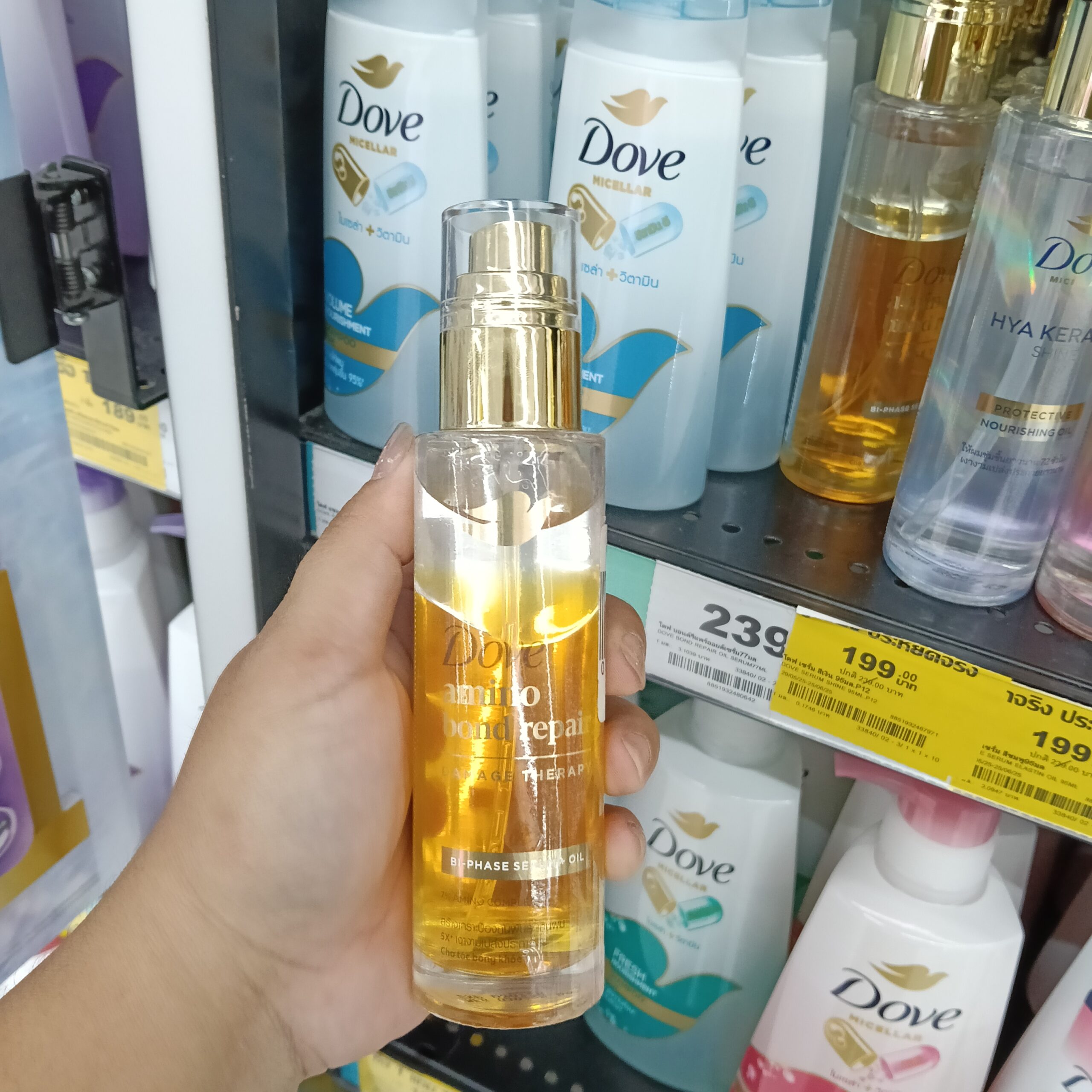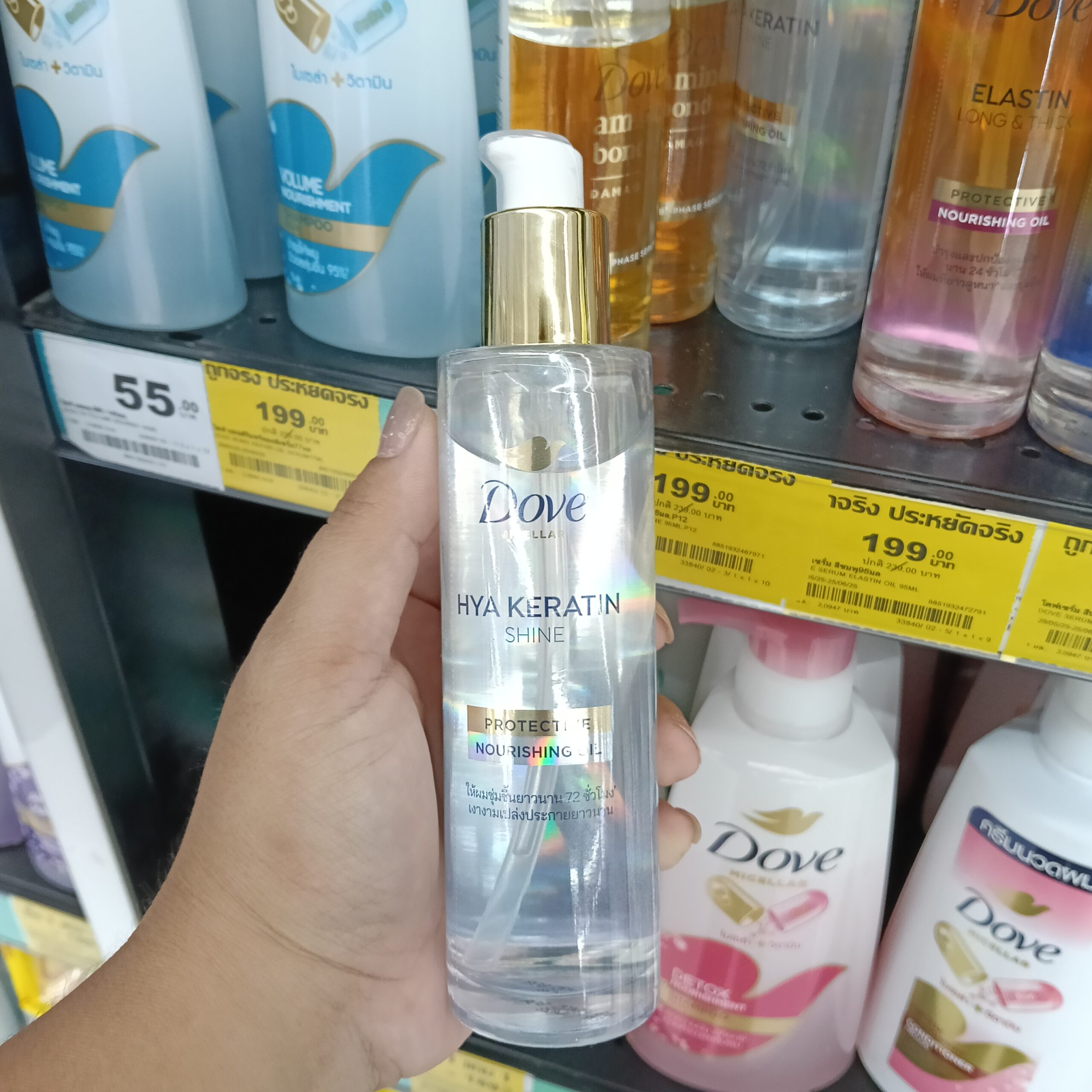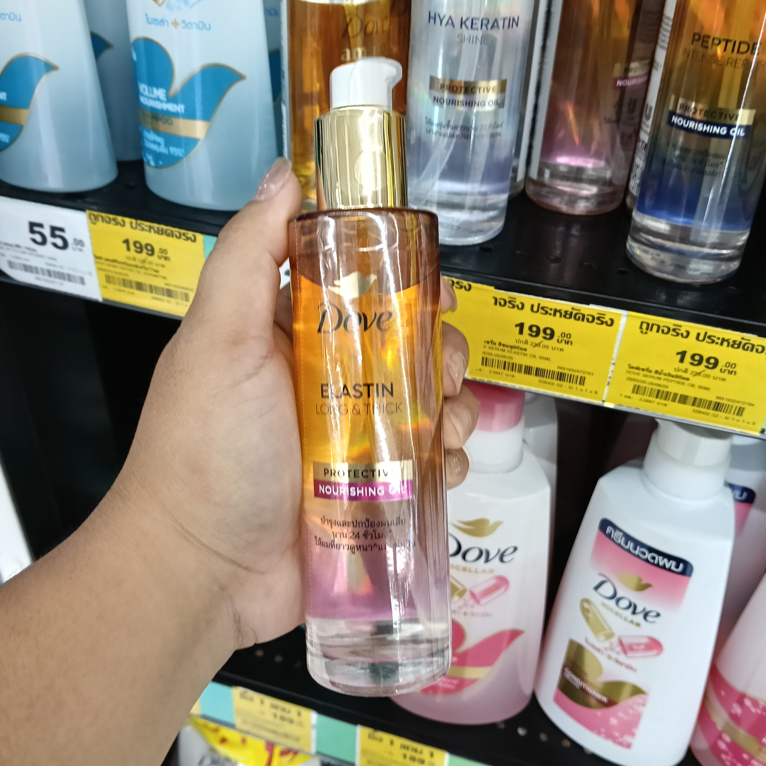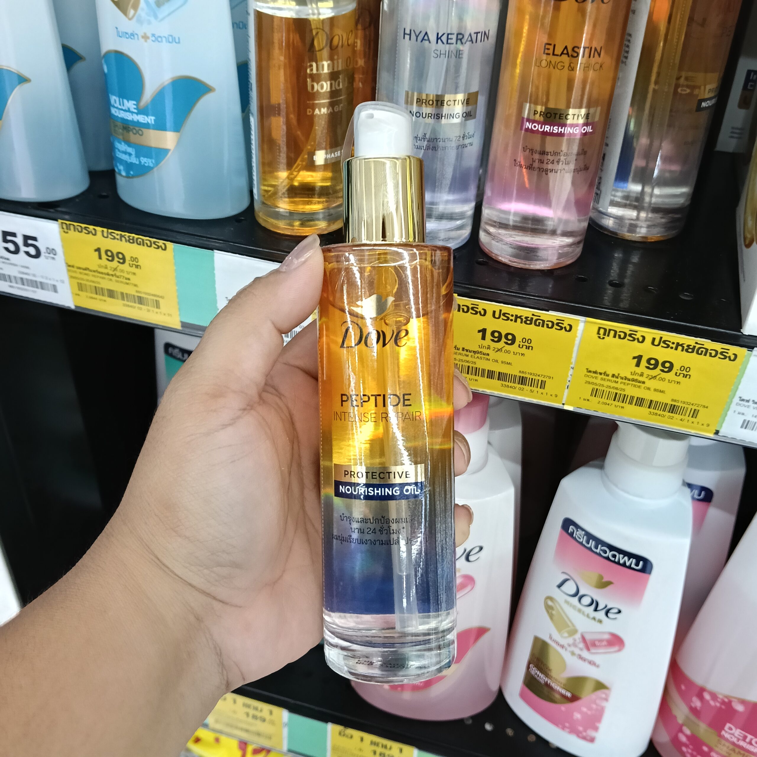 dầu dưỡng tóc Dove Protective Nourishing Oil đến từ Thái Lan, mỗi loại được thiết kế với công thức riêng biệt để giải quyết các vấn đề tóc cụ thể. Sản phẩm dạng dầu-serum hai lớp (bi-phase oil-serum) mỏng nhẹ, không cần xả lại với nước, giúp nuôi dưỡng và bảo vệ tóc khỏi hư tổn do nhiệt và tia UV suốt 24 giờ.
