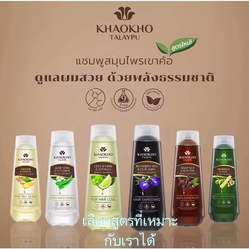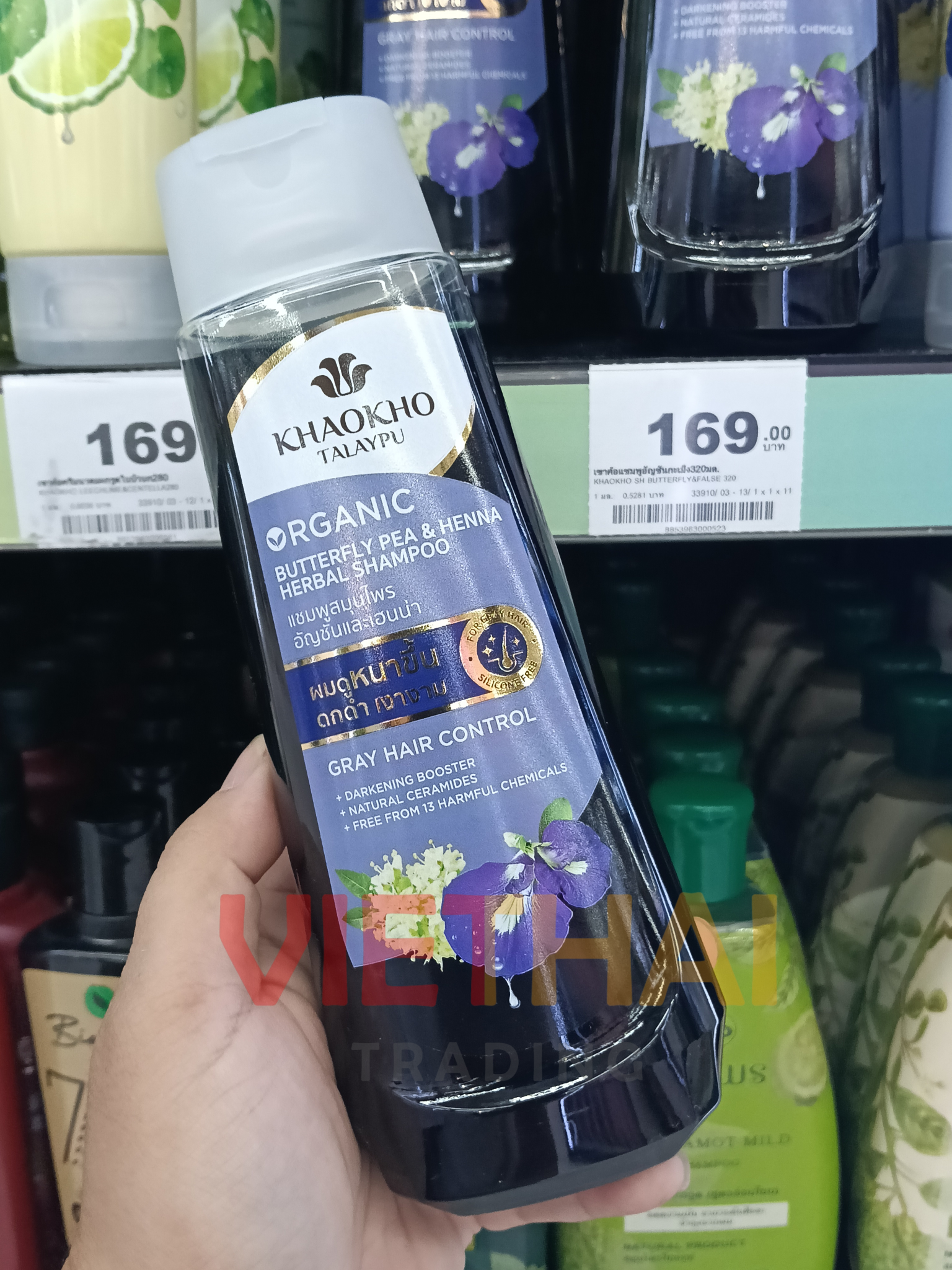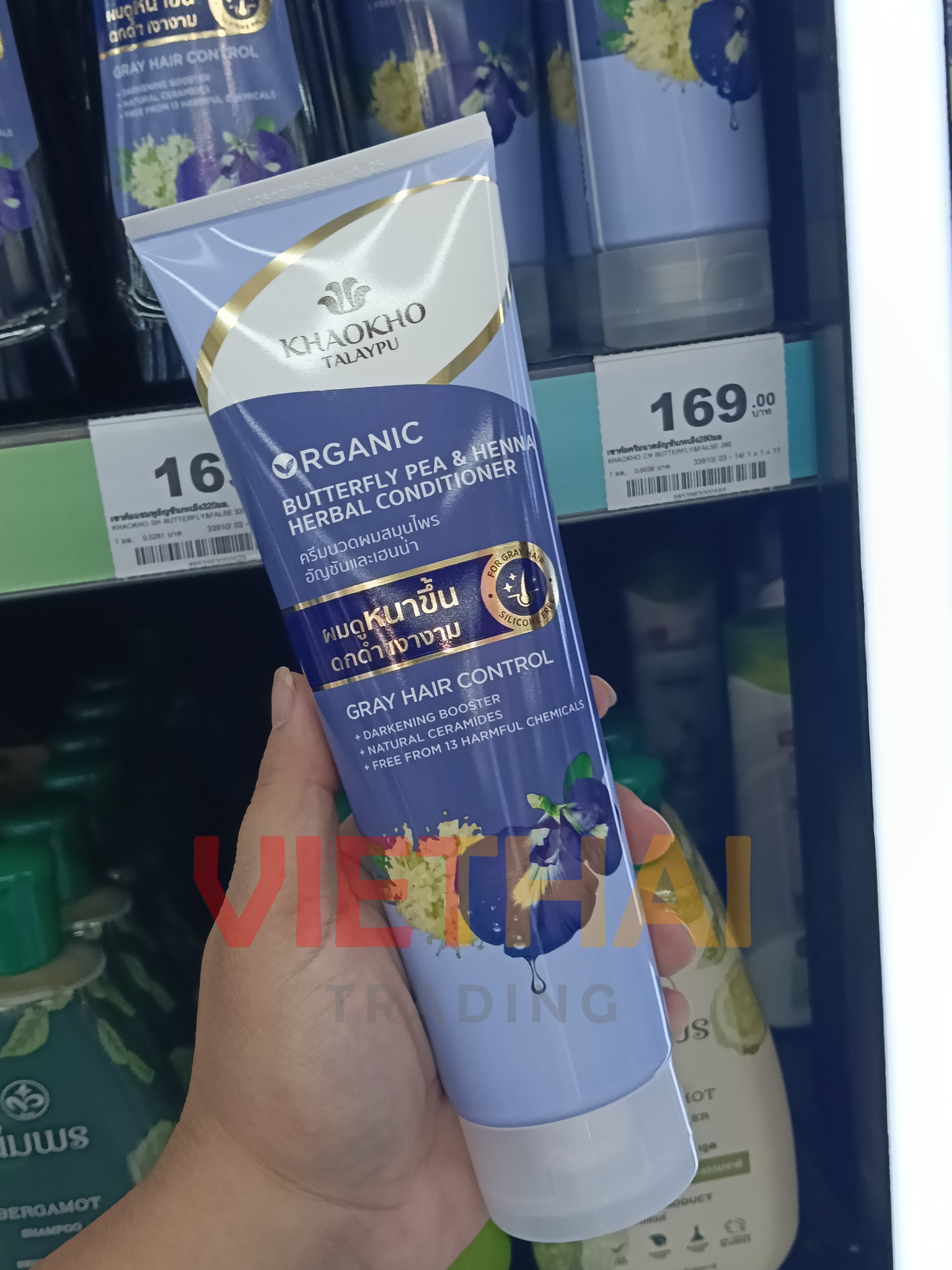 Công thức dầu gội và dầu xả thảo dược độc đáo của Khao Kho giúp tóc dày và bóng mượt. Sản phẩm kết hợp sức mạnh của hai loại thảo dược 100% tự nhiên: chiết xuất Anthocyanin từ hoa đậu bướm giúp tóc đen hơn và dày hơn, cùng với rau má (Centella asiatica/Gotu Kola) chứa Flavonoid & Terpene, các chất chống oxy hóa mạnh mẽ giúp làm chậm quá trình bạc tóc. Không chứa 9 hóa chất độc hại và silicon, sản phẩm giúp tóc khỏe mạnh và bóng mượt.
