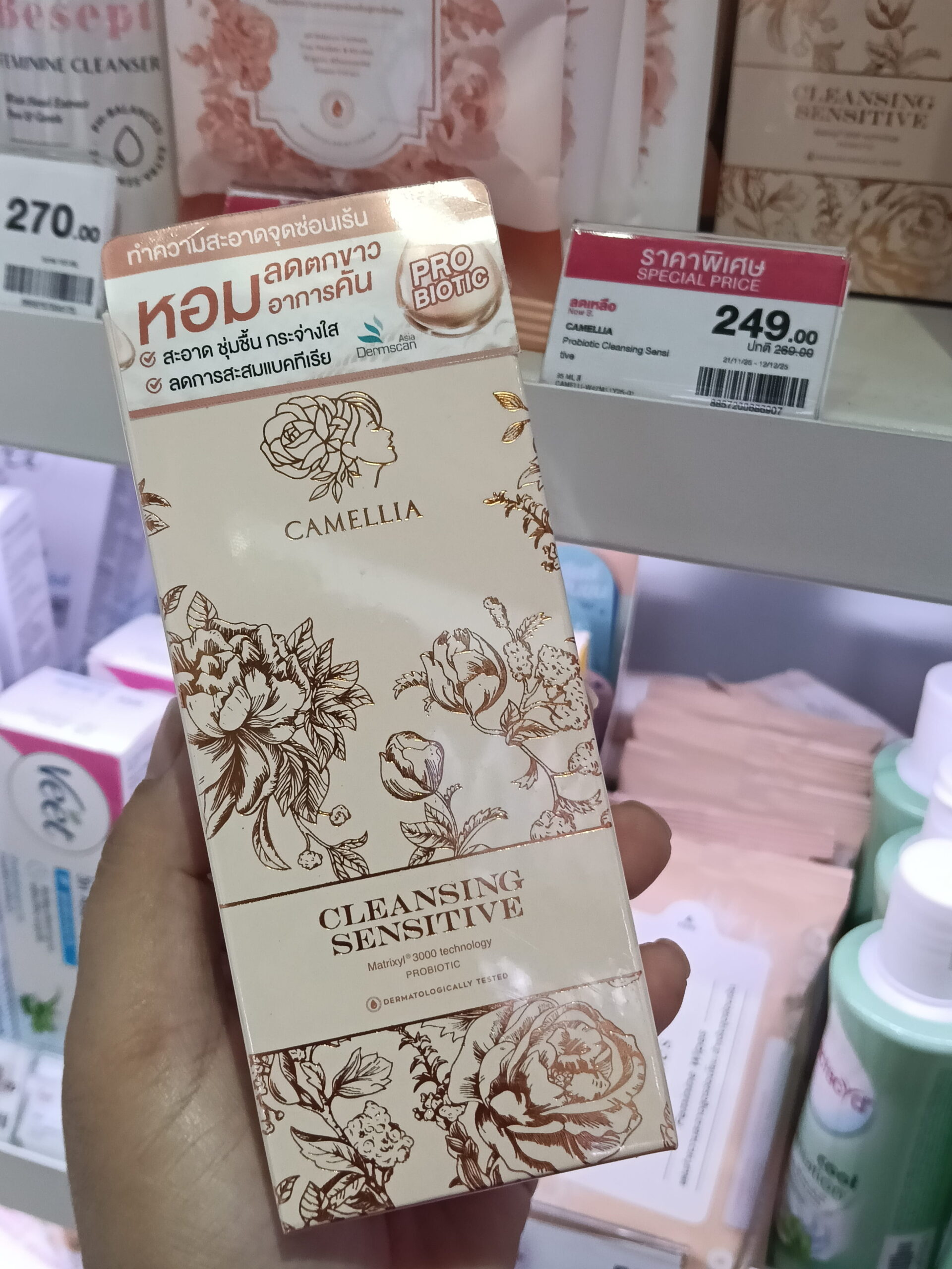 Dung dịch vệ sinh phụ nữ Camellia Cleansing Sensitive, một sản phẩm chăm sóc vùng kín đến từ Thái Lan. Sản phẩm này tập trung vào việc làm sạch nhẹ nhàng và duy trì sự cân bằng tự nhiên cho khu vực nhạy cảm.