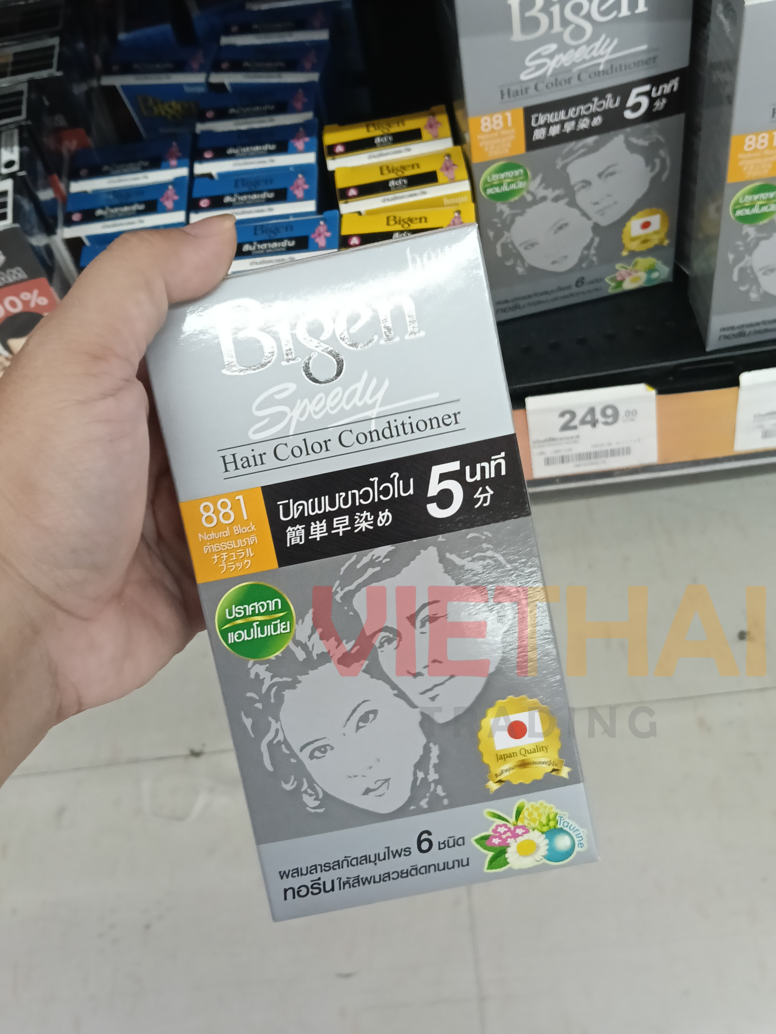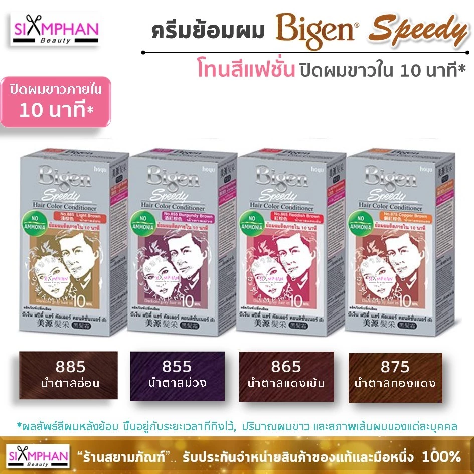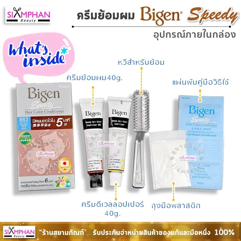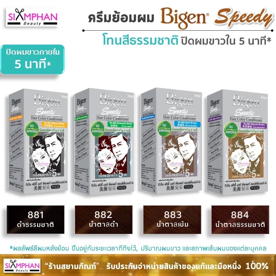 . • Sản phẩm này không dành cho người dưới 16 tuổi. Dầu xả nhuộm tóc nhanh Bigen Speedy Hair Color Conditioner nhuộm tóc trong 5 phút. Có 8 màu: 881 Đen tự nhiên, 882 Nâu đậm, 883 Nâu đậm, 884 Nâu tự nhiên, 885 Nâu nhạt, 855 Nâu tím, 865 Nâu đỏ đậm, 875 Nâu đồng. Chuẩn bị và sử dụng: 1. Bóp một lượng kem bằng nhau từ mỗi tuýp lên lược nhuộm tóc. 2. Bắt đầu chải từ vùng tóc bạc nhiều nhất. 3. Chờ 5 phút, xả sạch tóc với nước sạch, sau đó gội đầu như bình thường.