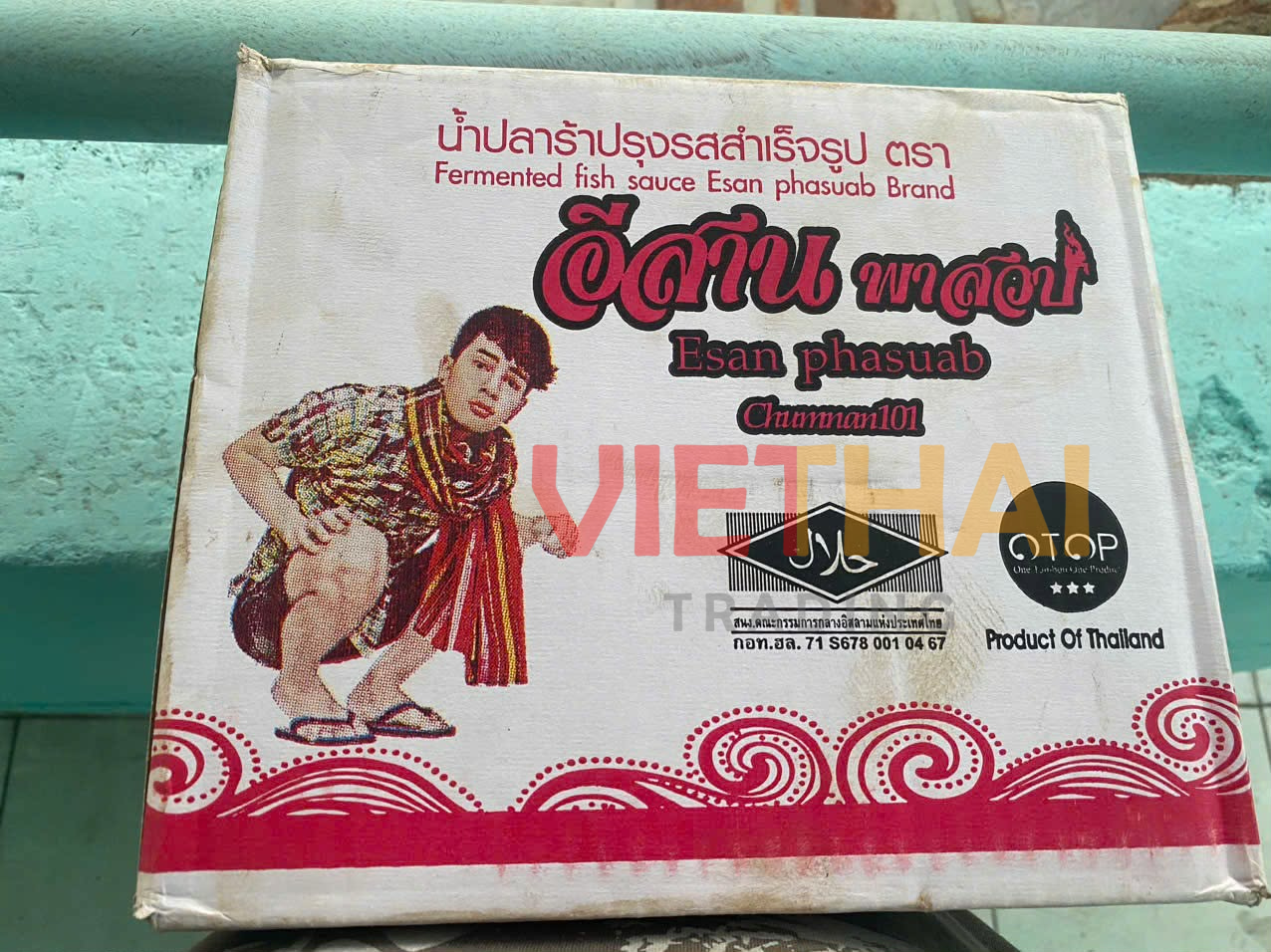 Nước mắm cá ủ men Esan Phasuab là một loại gia vị nổi tiếng của Thái Lan, đặc biệt phổ biến trong ẩm thực vùng Đông Bắc (Isaan). Sản phẩm này được làm từ cá nhỏ (thường là cá cơm hoặc cá thu) lên men với muối và nước trong vài tháng, tạo nên hương vị đậm đà và mùi thơm đặc trưng.