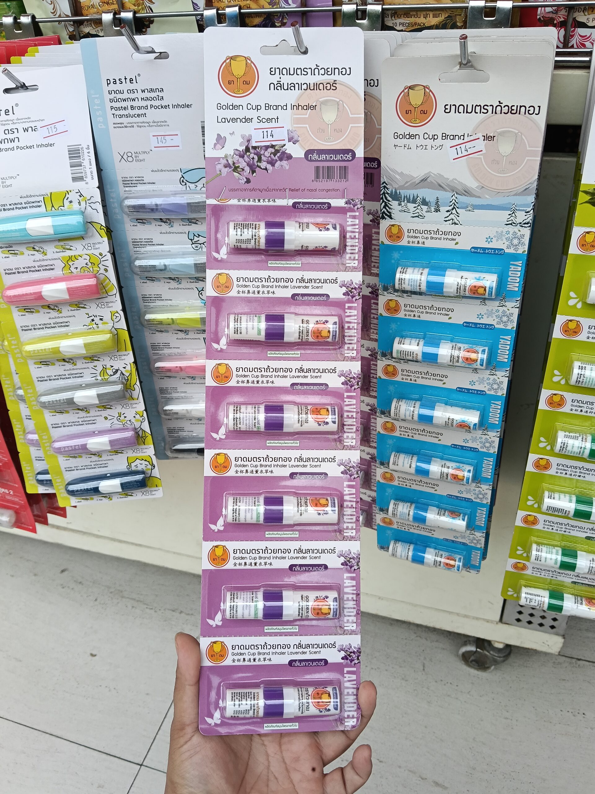 Ống hít thông mũi Golden Cup Brand Inhaler hương oải hương (Lavender Scent), một sản phẩm chăm sóc sức khỏe thảo dược phổ biến và tiện lợi đến từ Thái Lan.