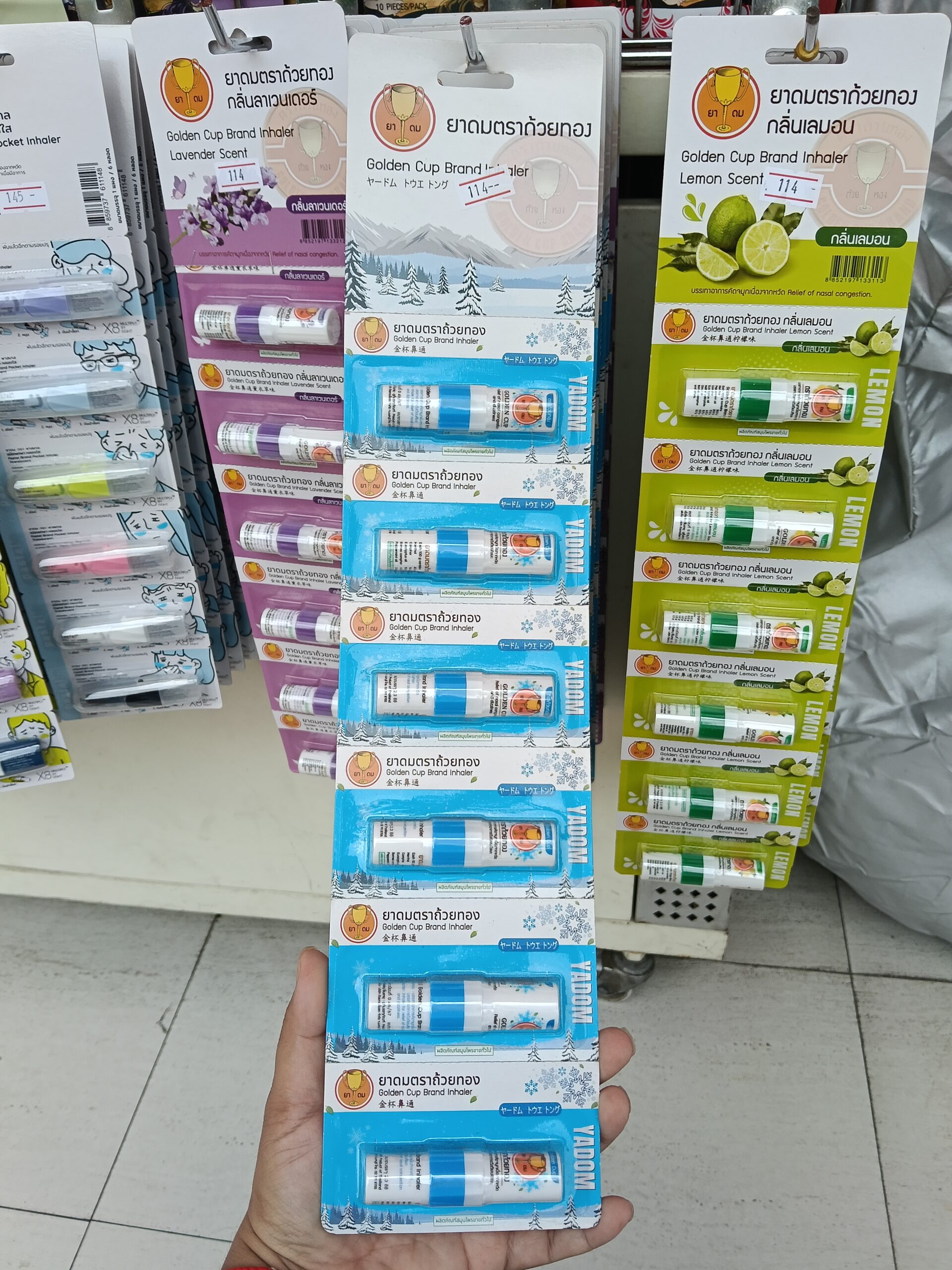 Ống hít thông mũi Golden Cup Brand Inhaler, một sản phẩm chăm sóc sức khỏe thảo dược phổ biến có xuất xứ từ Thái Lan. Sản phẩm này được thiết kế nhỏ gọn, tiện lợi để mang theo bên mình và sử dụng mọi lúc mọi nơi.
