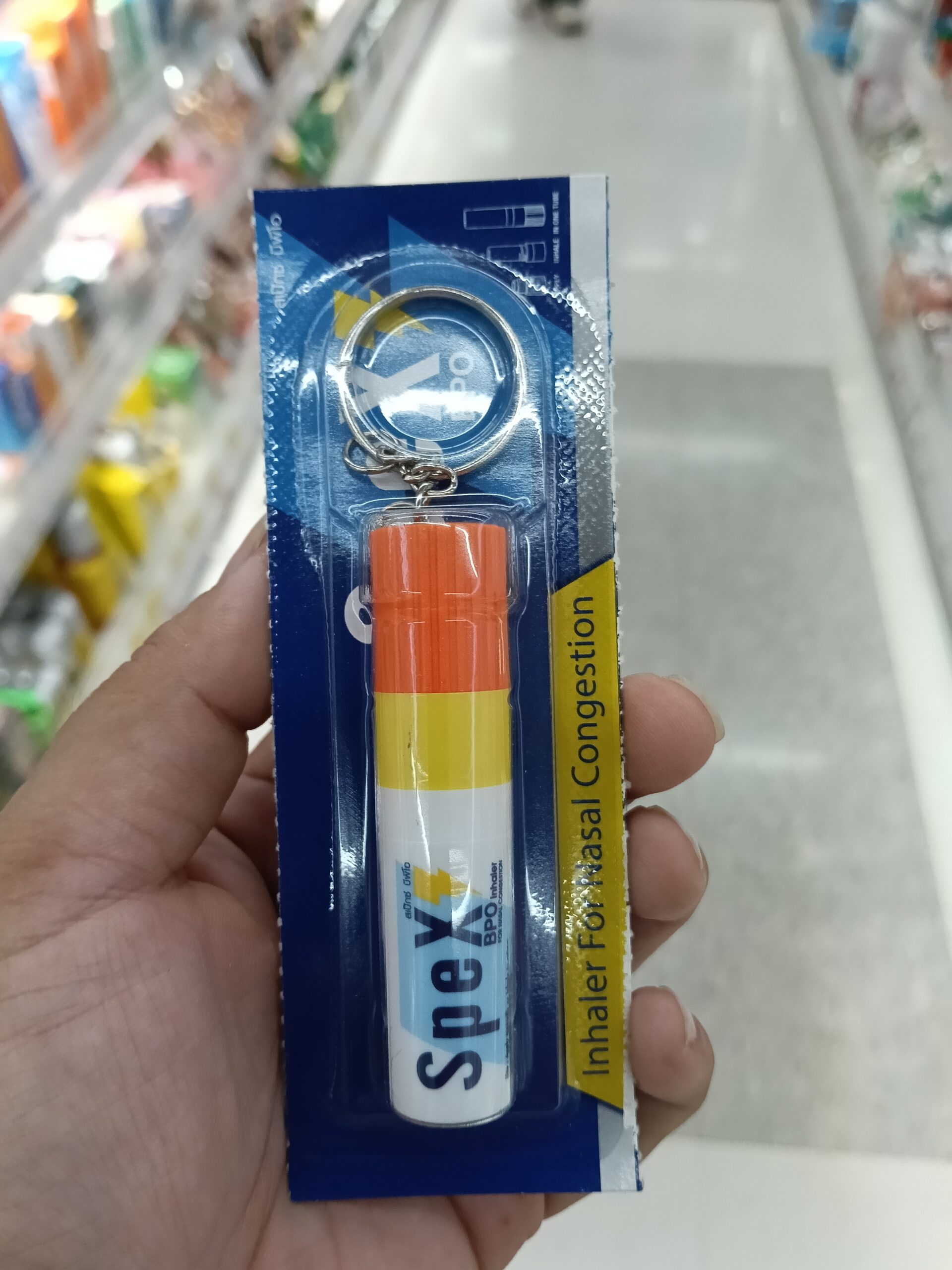 Ống hít thông mũi SpeX BPO Inhaler, một sản phẩm thông mũi phổ biến có xuất xứ từ Thái Lan, do công ty Burapha Ousod (BPO) sản xuất. Sản phẩm được thiết kế tiện lợi với hai chức năng trong một ống nhỏ gọn 2ml và thường đi kèm với móc khóa.