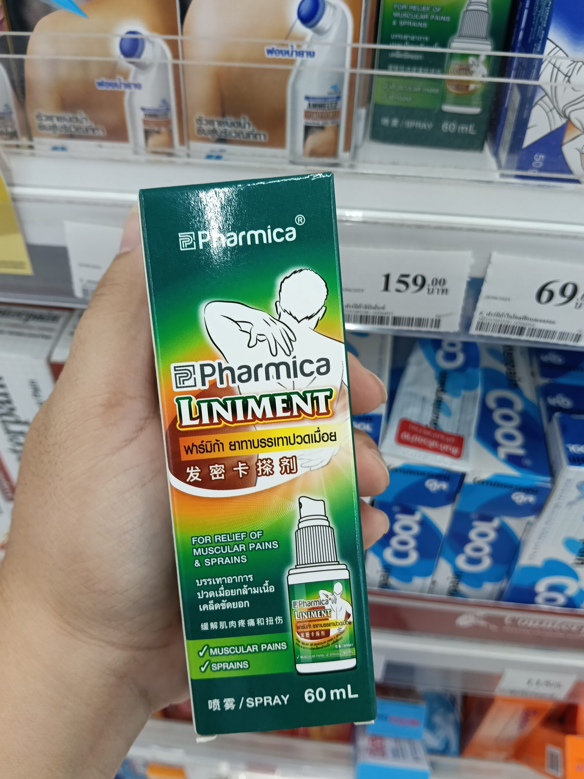 Pharmica Liniment Spray (ฟาร์มิก้า ลินิเมนต์), một loại thuốc xoa bóp dạng xịt được sử dụng để giảm đau và viêm tại các cơ và khớp. Sản phẩm được sản xuất bởi công ty Thái Lan NBD Healthcare, dựa trên công thức thảo dược truyền thống của Đài Loan.