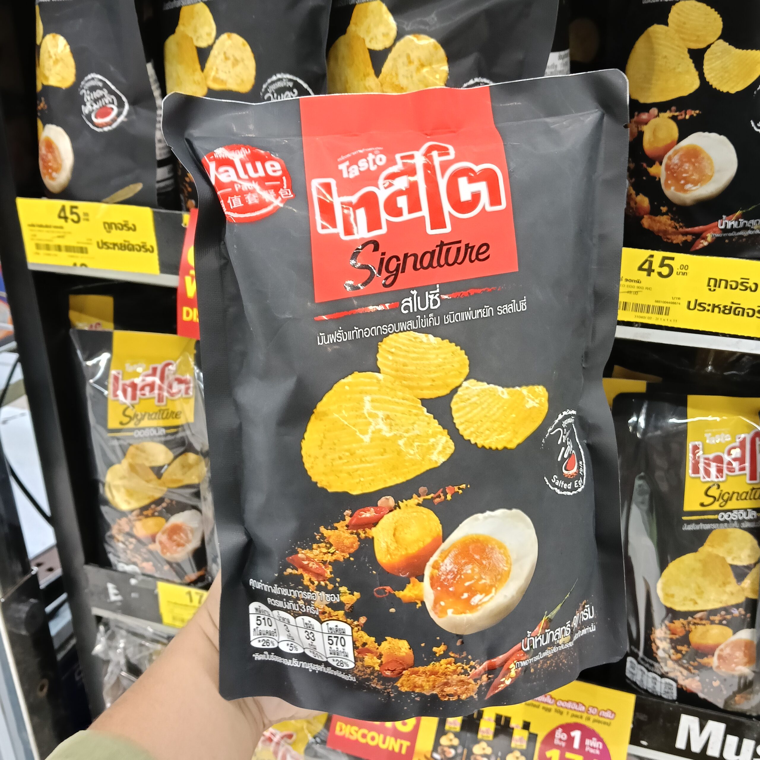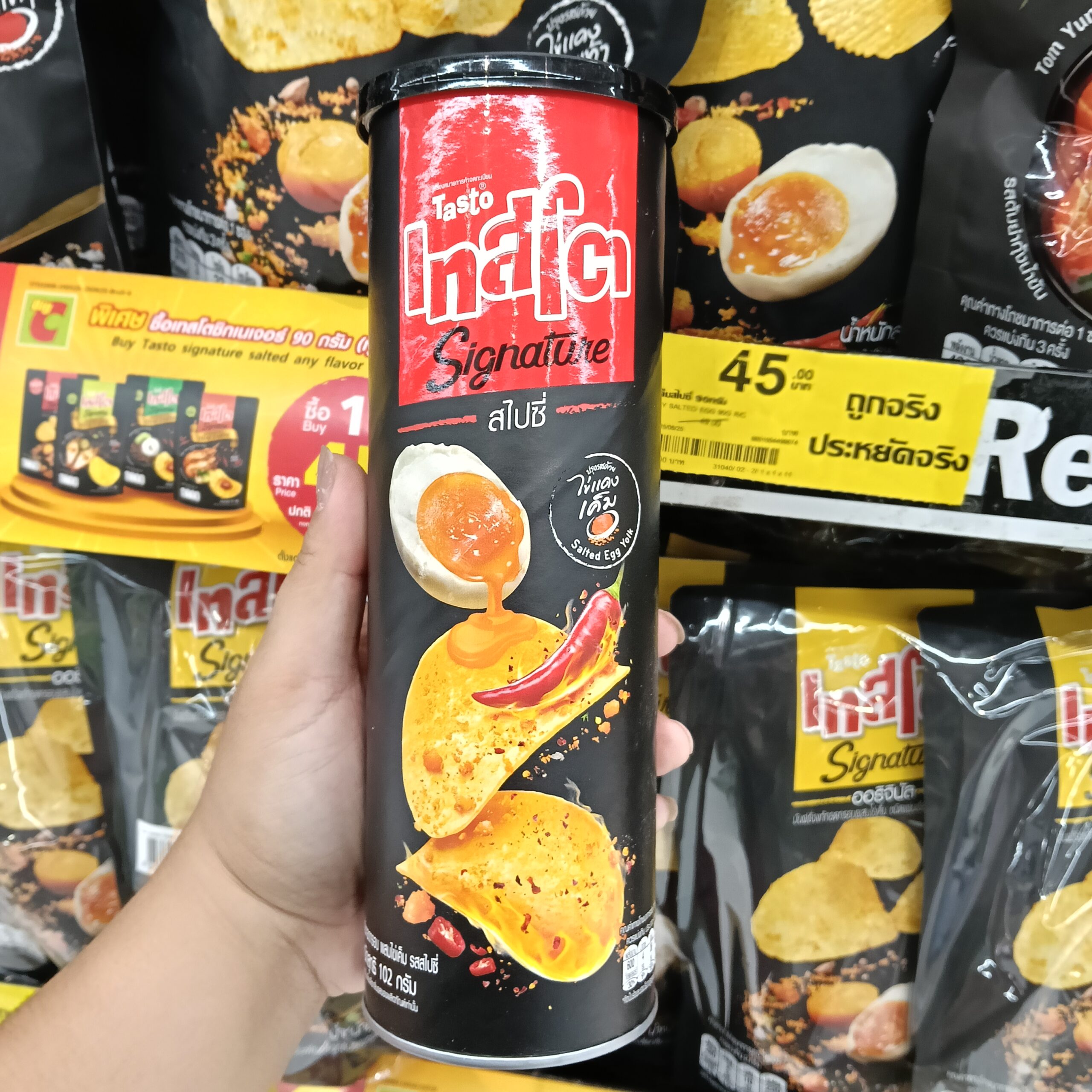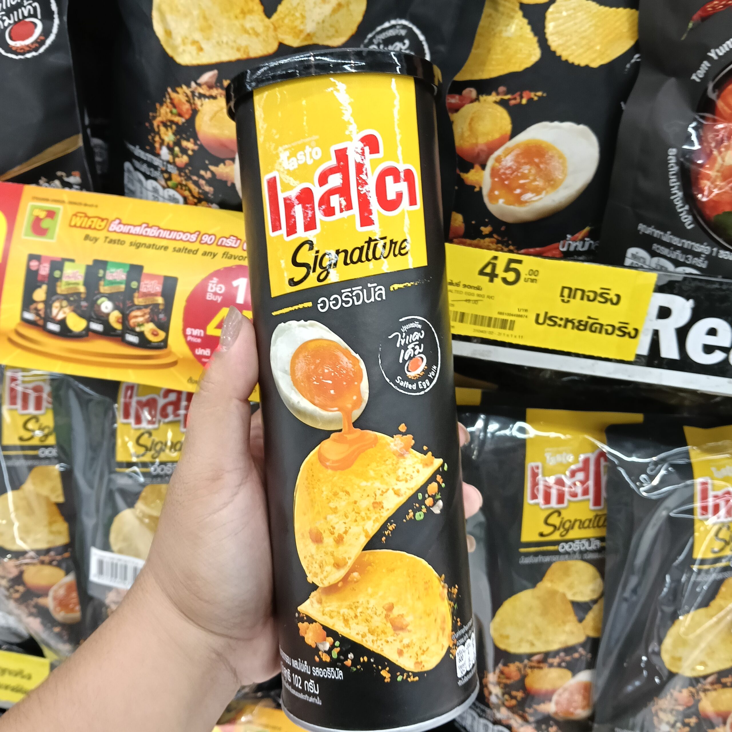 snack khoai tây Tasto Signature vị trứng muối cay, một món ăn vặt rất phổ biến và được yêu thích đến từ Thái Lan.