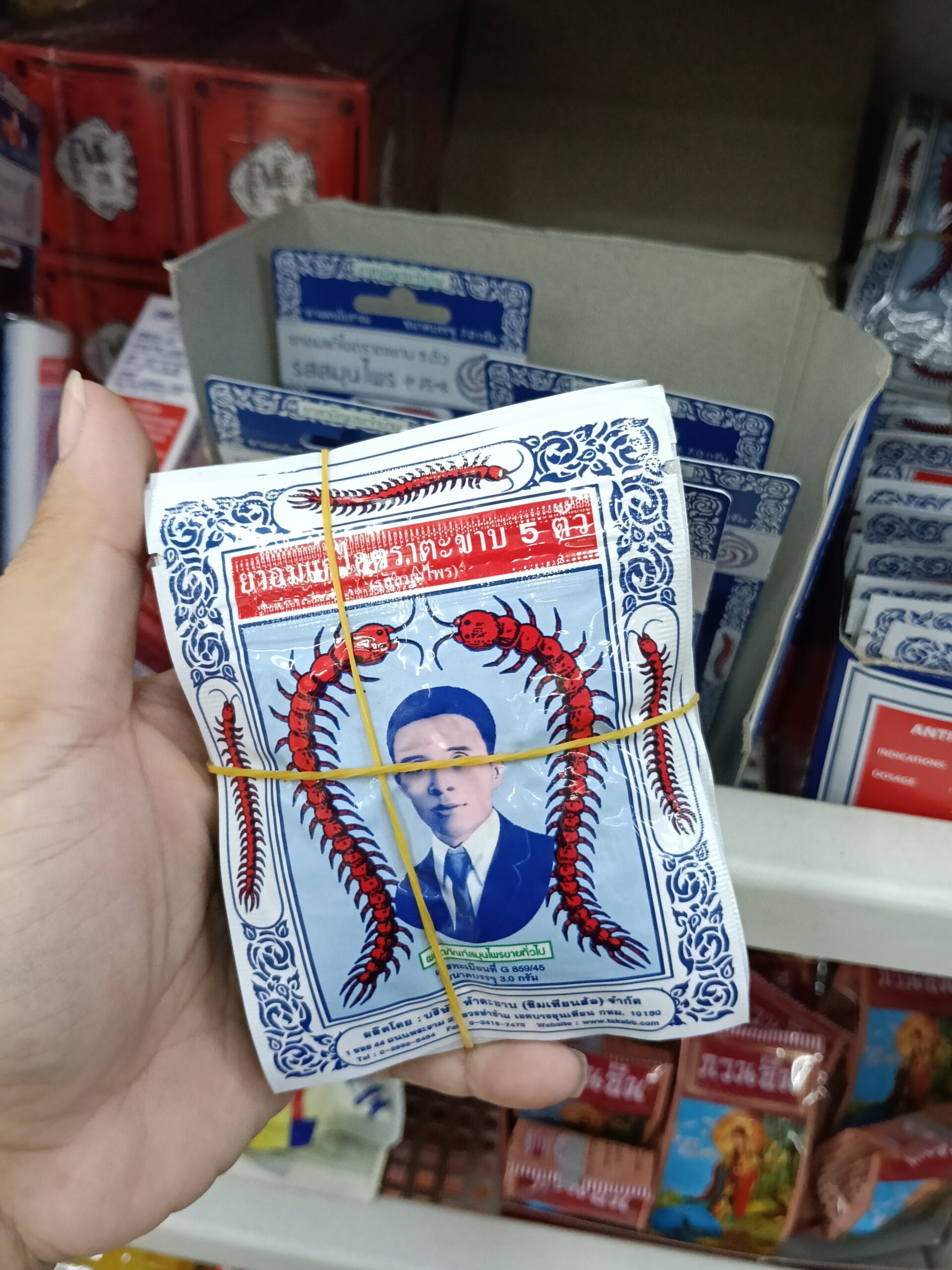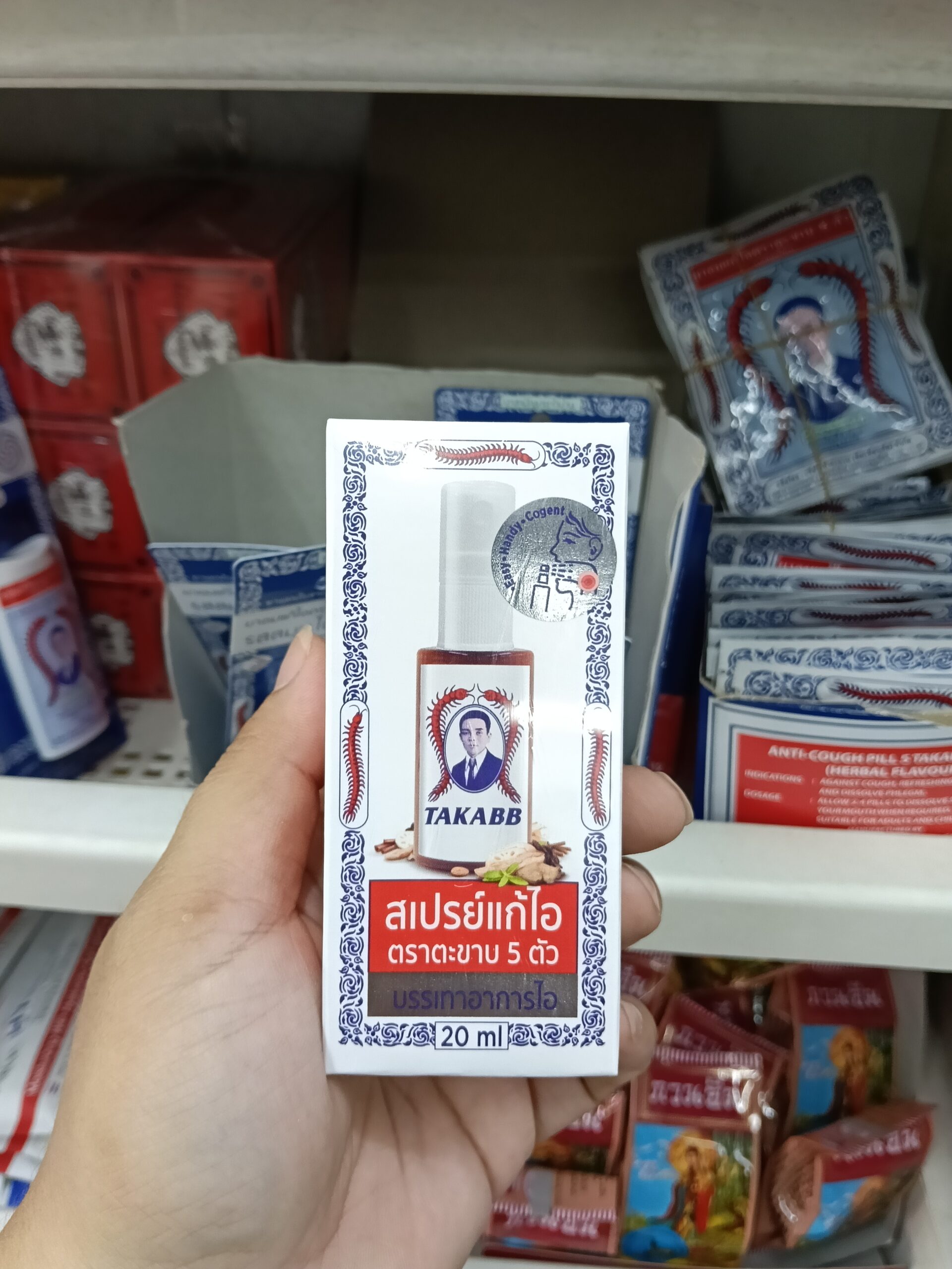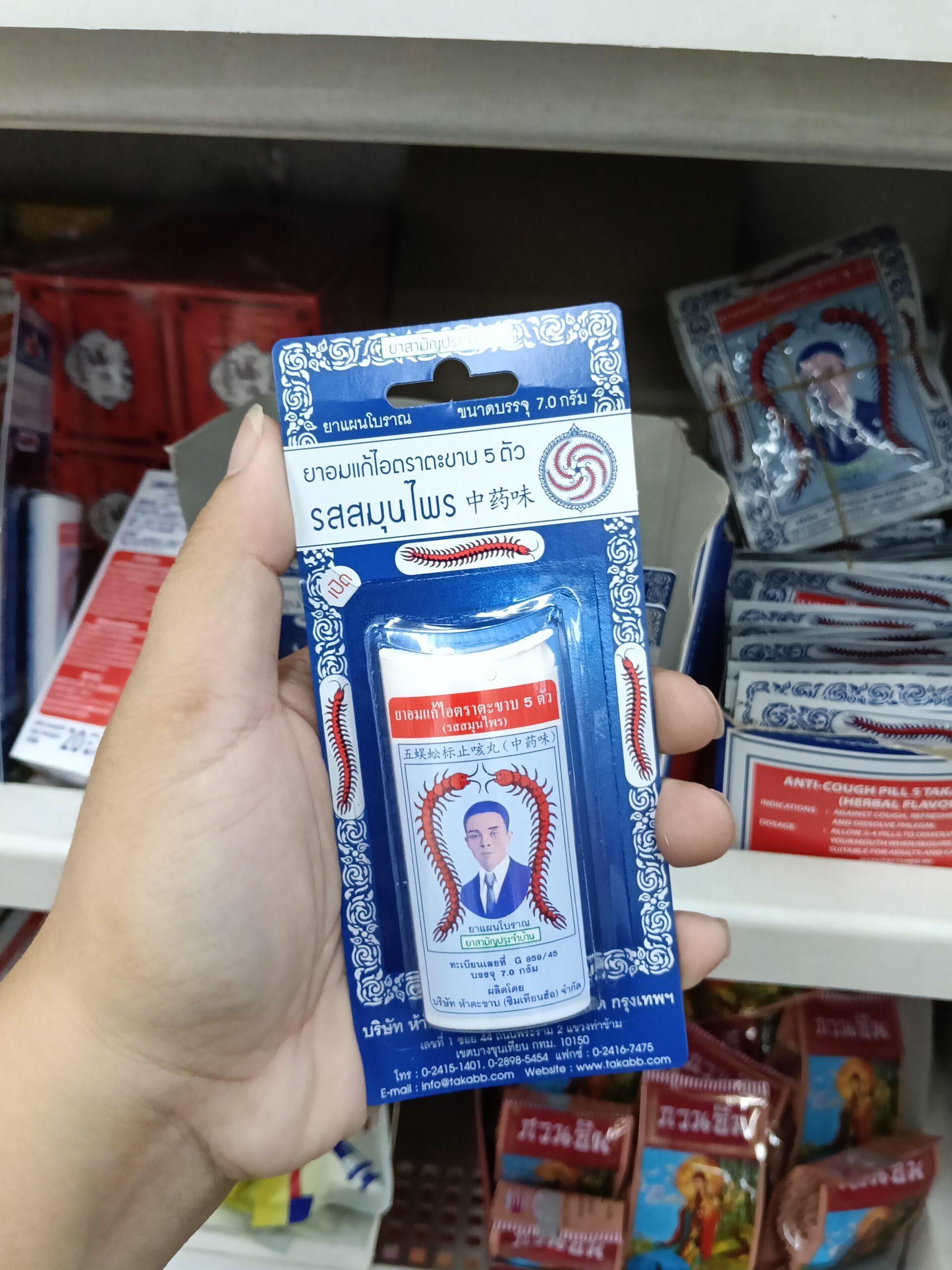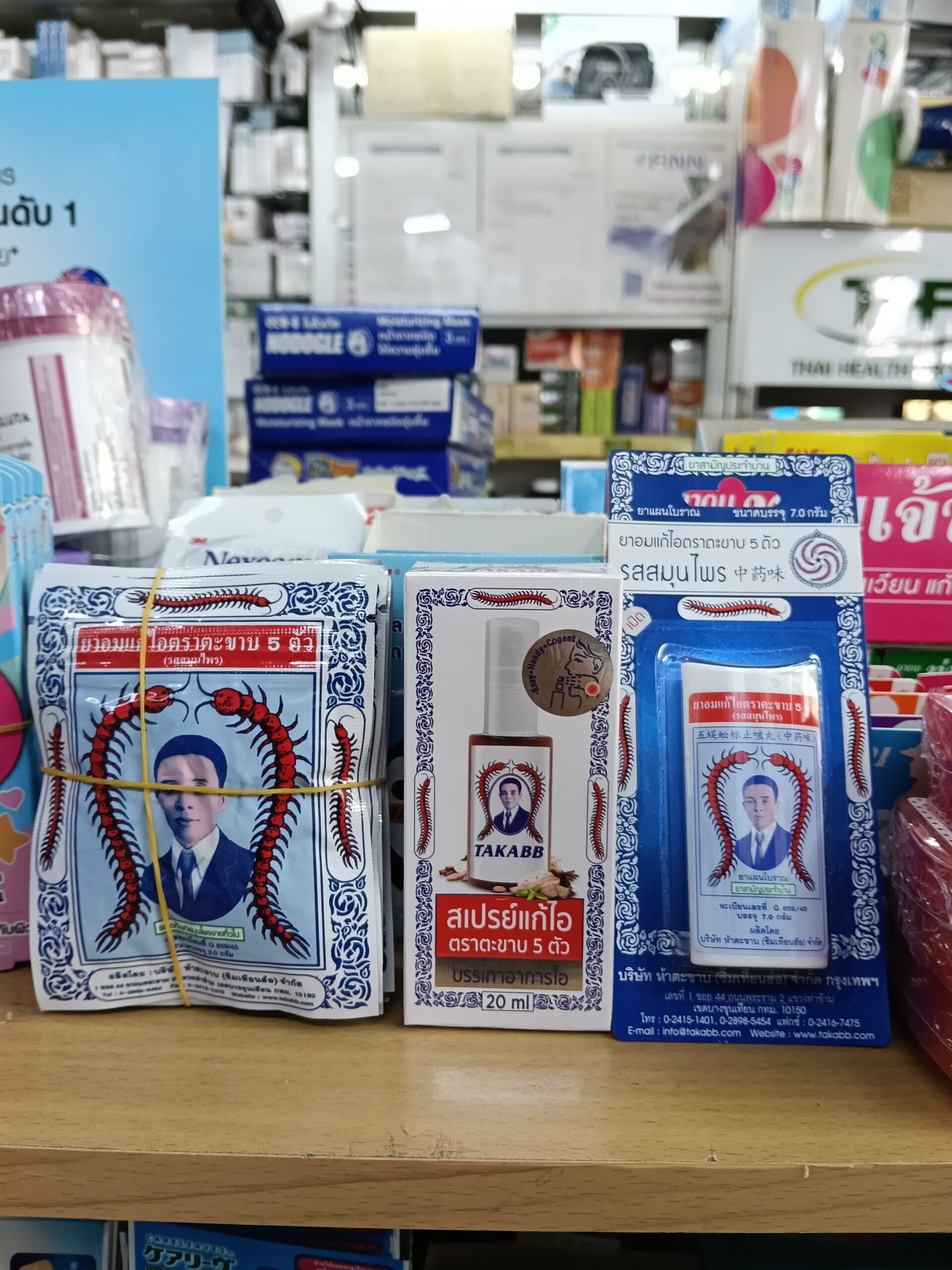Các sản phẩm trong hình bao gồm:trị ho nổi tiếng của thương hiệu Thái Lan Takabb (Hòa Hưng – 5 Con Rết).